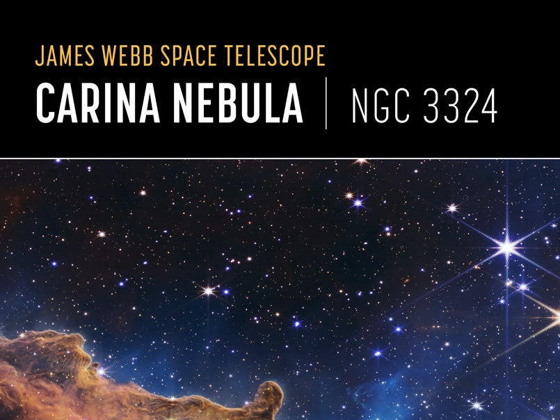 "The seemingly three-dimensional “Cosmic Cliffs” showcases Webb’s capabilities to peer through obscuring dust and shed new light on how stars form. Webb reveals emerging stellar nurseries and individual stars that are completely hidden in visible-light pictures. This landscape of “mountains” and “valleys” is actually the edge of a nearby stellar nursery called NGC 3324 at the northwest corner of the Carina Nebula.