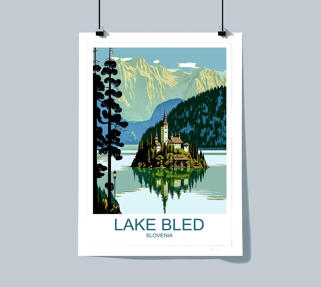 Designed by WallArty ai Generated. Lake Bled Slovenia Travel Poster by Wed - Poster Paper or Canvas Print / Gift Idea / Wall Decor