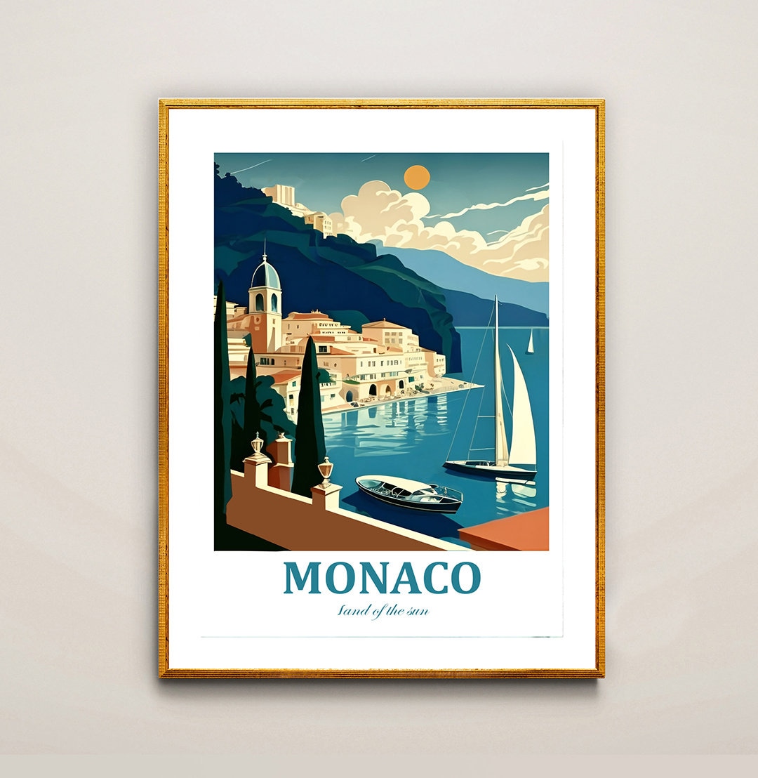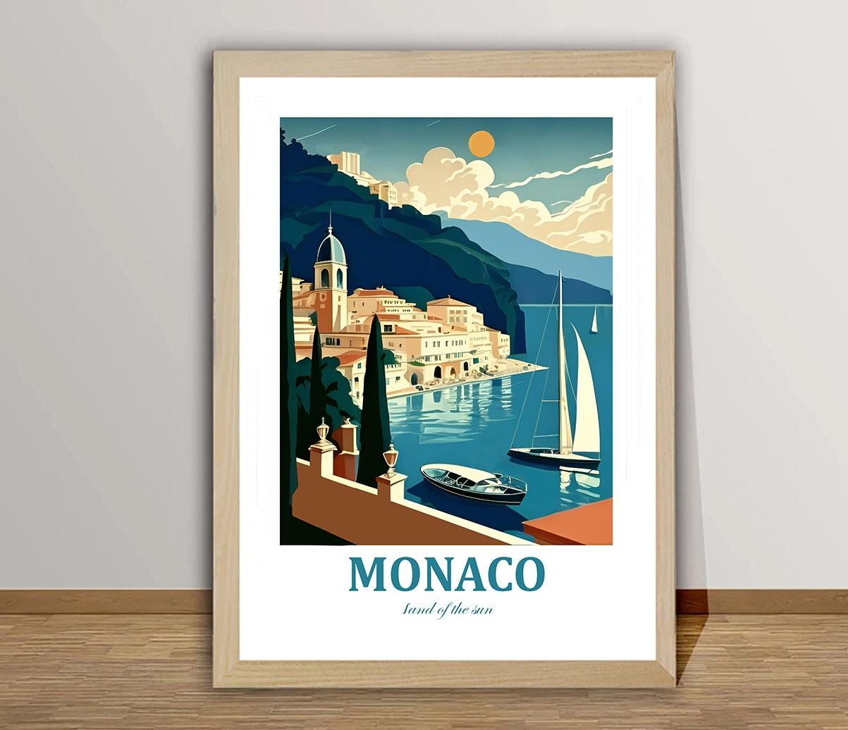 Designed by WallArty ai Generated. Monaco, Land of the Sun France Modern Travel Poster by Wed - Poster Paper, Canvas Print / Gift Idea / Wall Decor