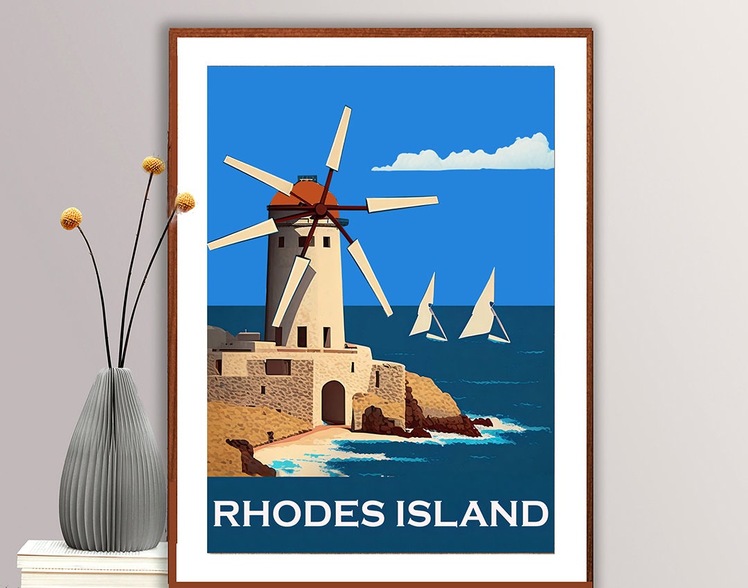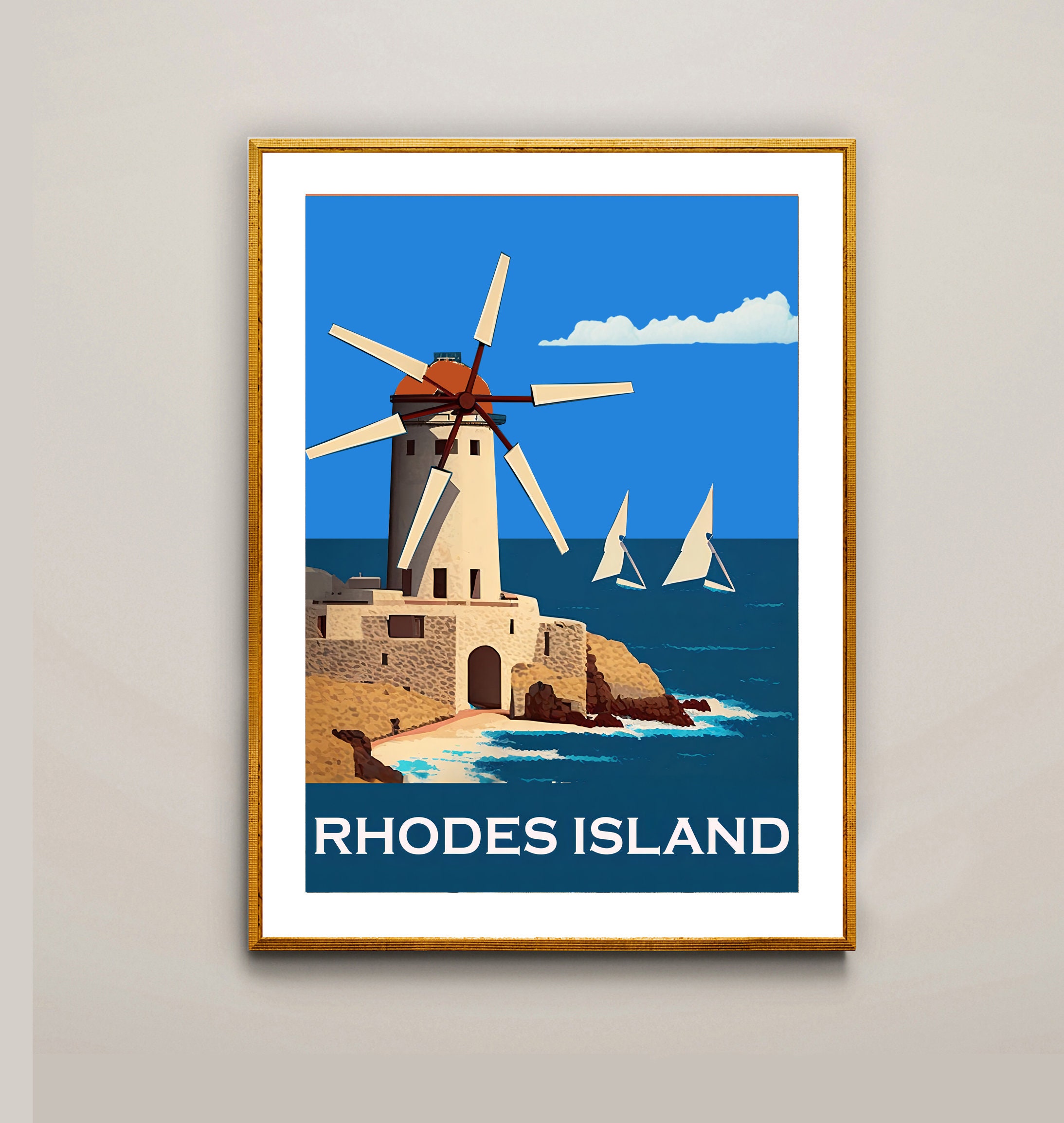 Rhodes Island Travel Poster: Modern Windmill Art Print