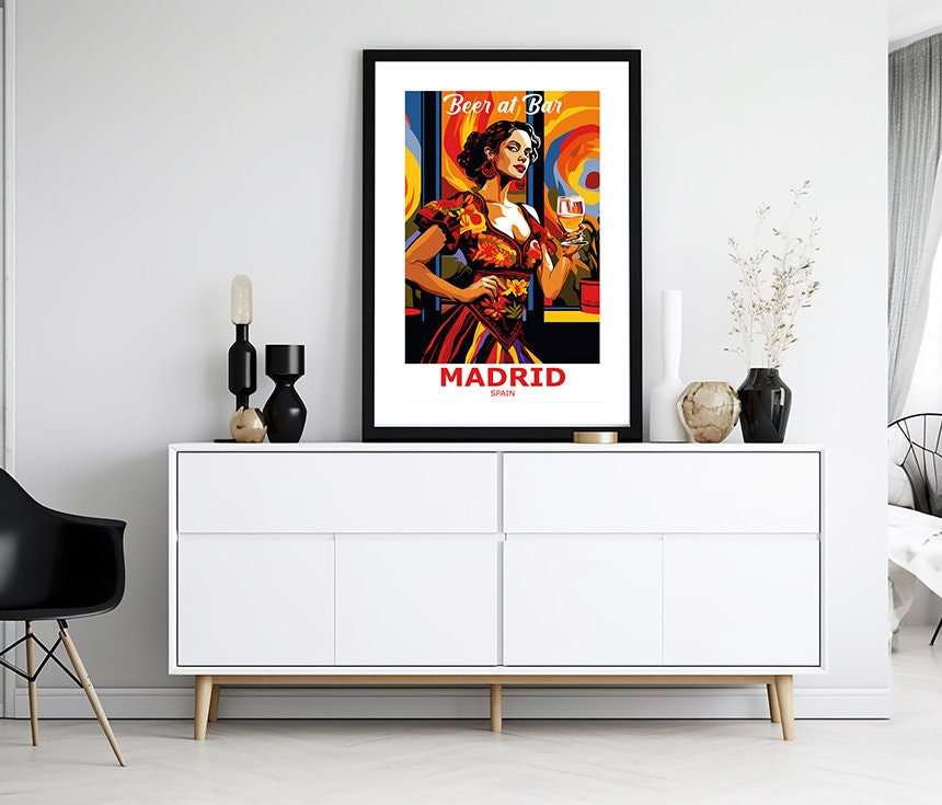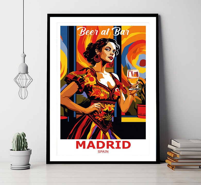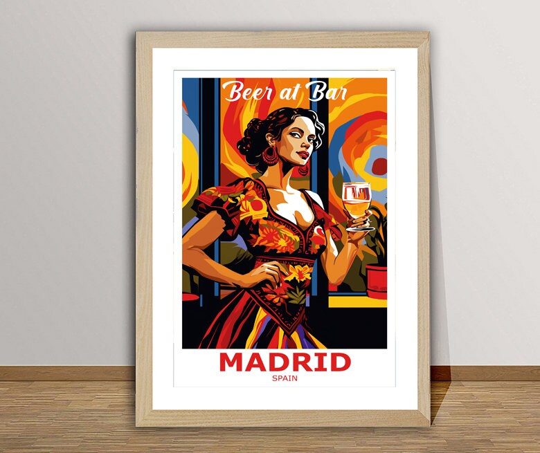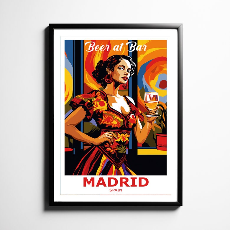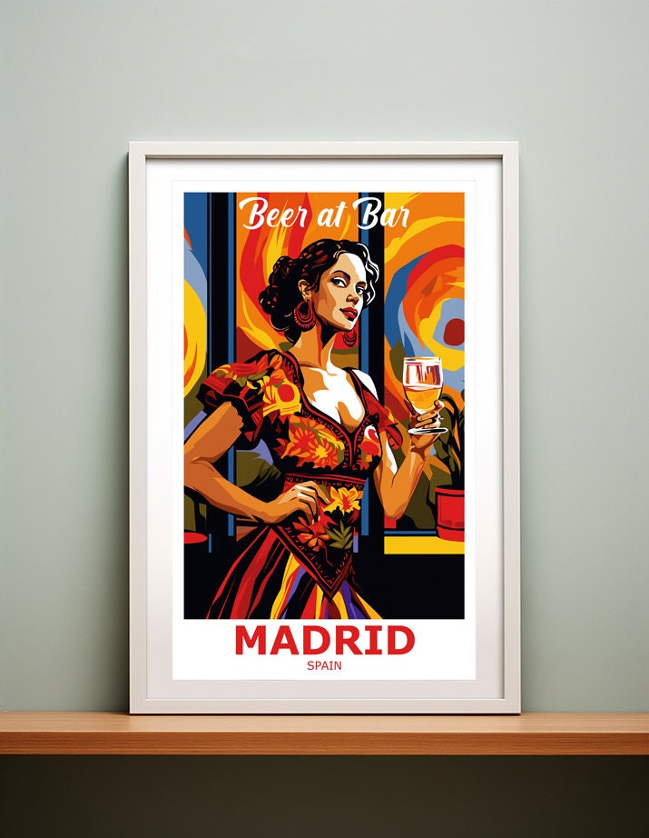 Designed by WallArty ai Generated. Beer at Bar, La Latina, Madrid Spain Travel Poster by Wed - Poster Paper or Canvas Print / Gift Idea / Wall Decor