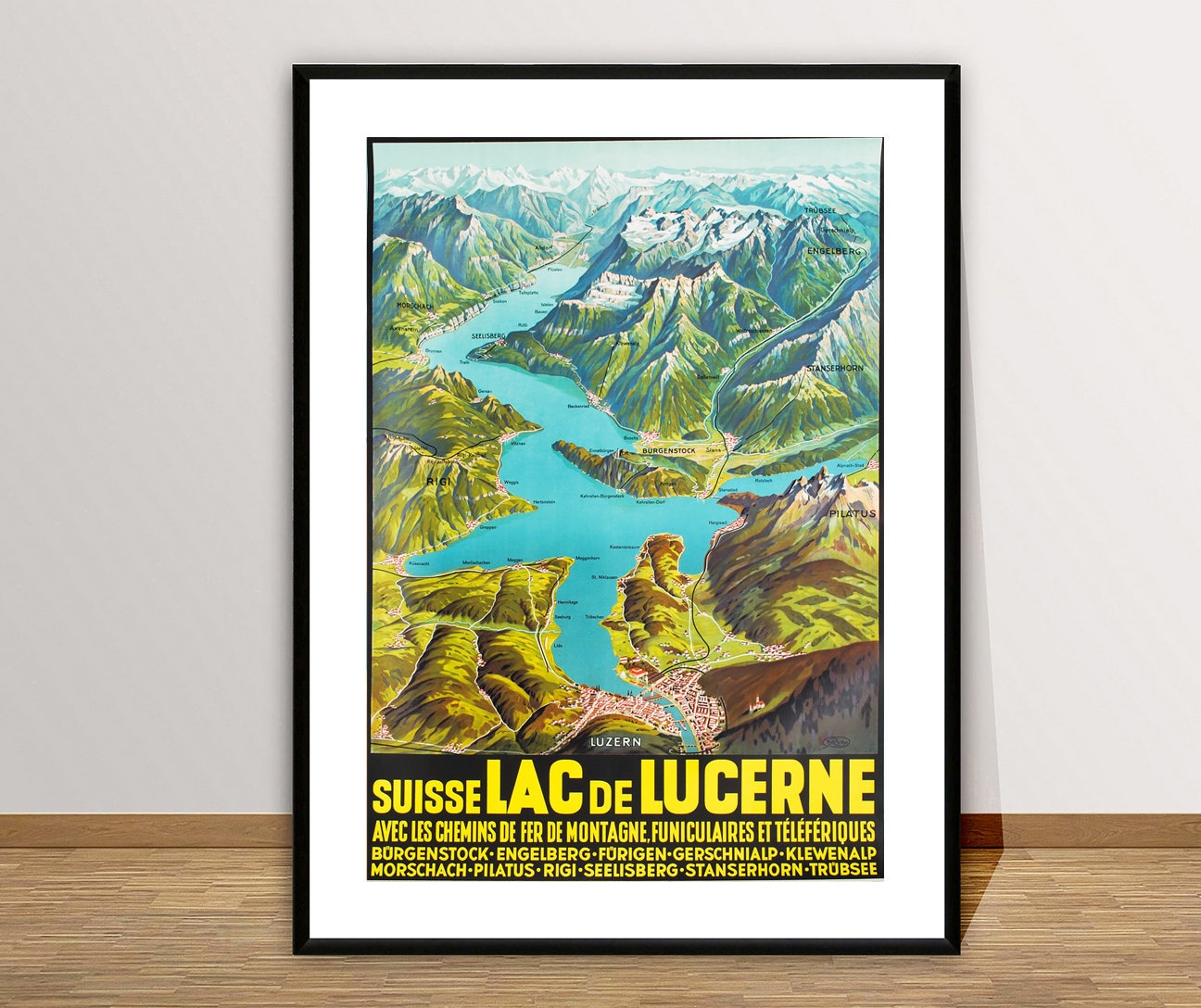 Suisse Lac de Lucerne avec les Chemins de fer de Montagne Funicularies and Teleferiques Vintage Travel Poster - Poster Paper or Canvas Print / Gift Idea / Wall Decor