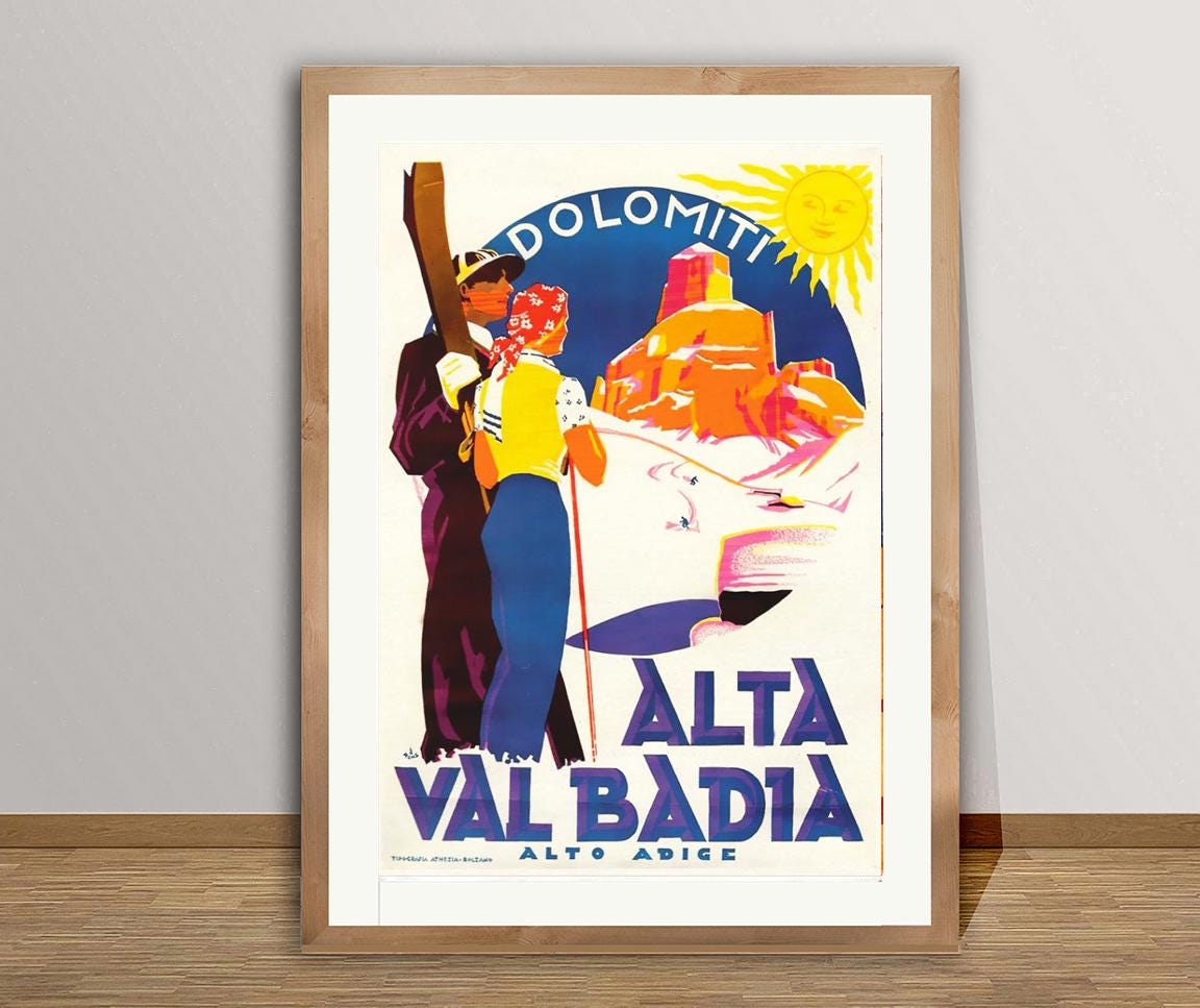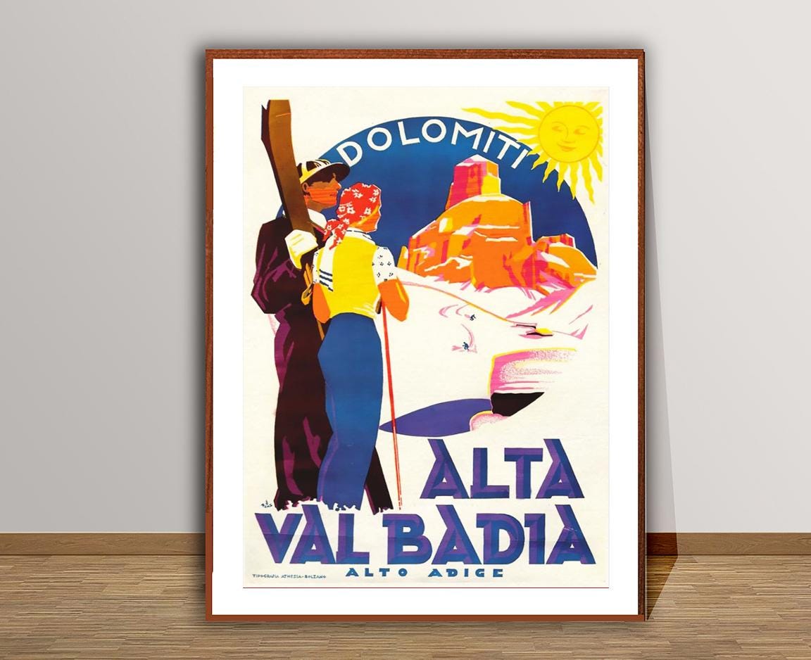 Alta Val Badia, Dolomiti, Alto Adige, Italy Vintage Ski Poster - Poster Paper or Canvas Print / Gift Idea