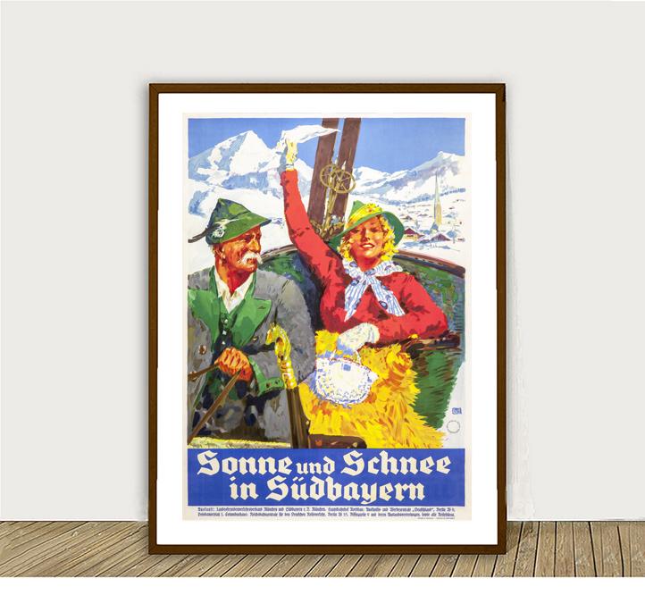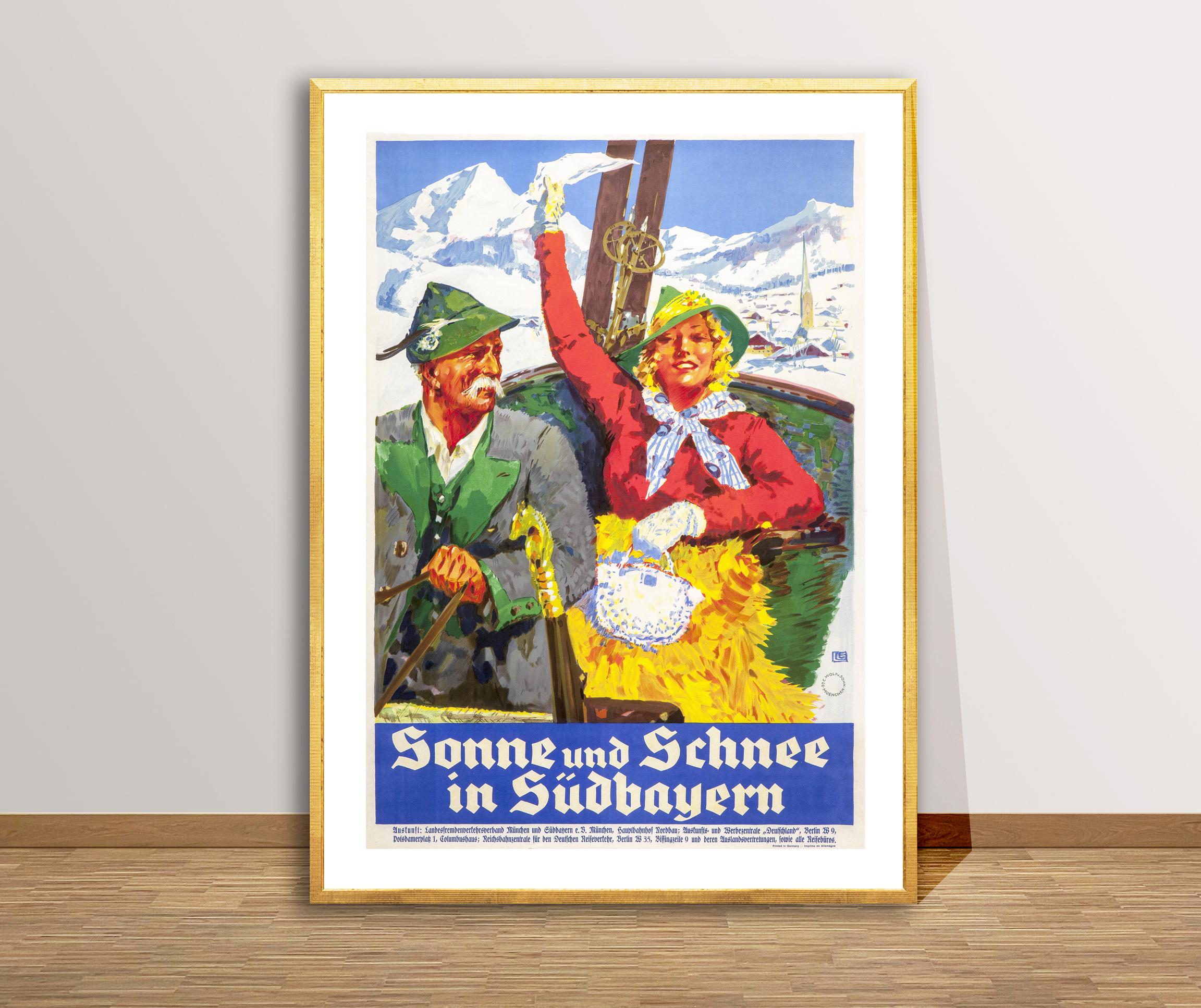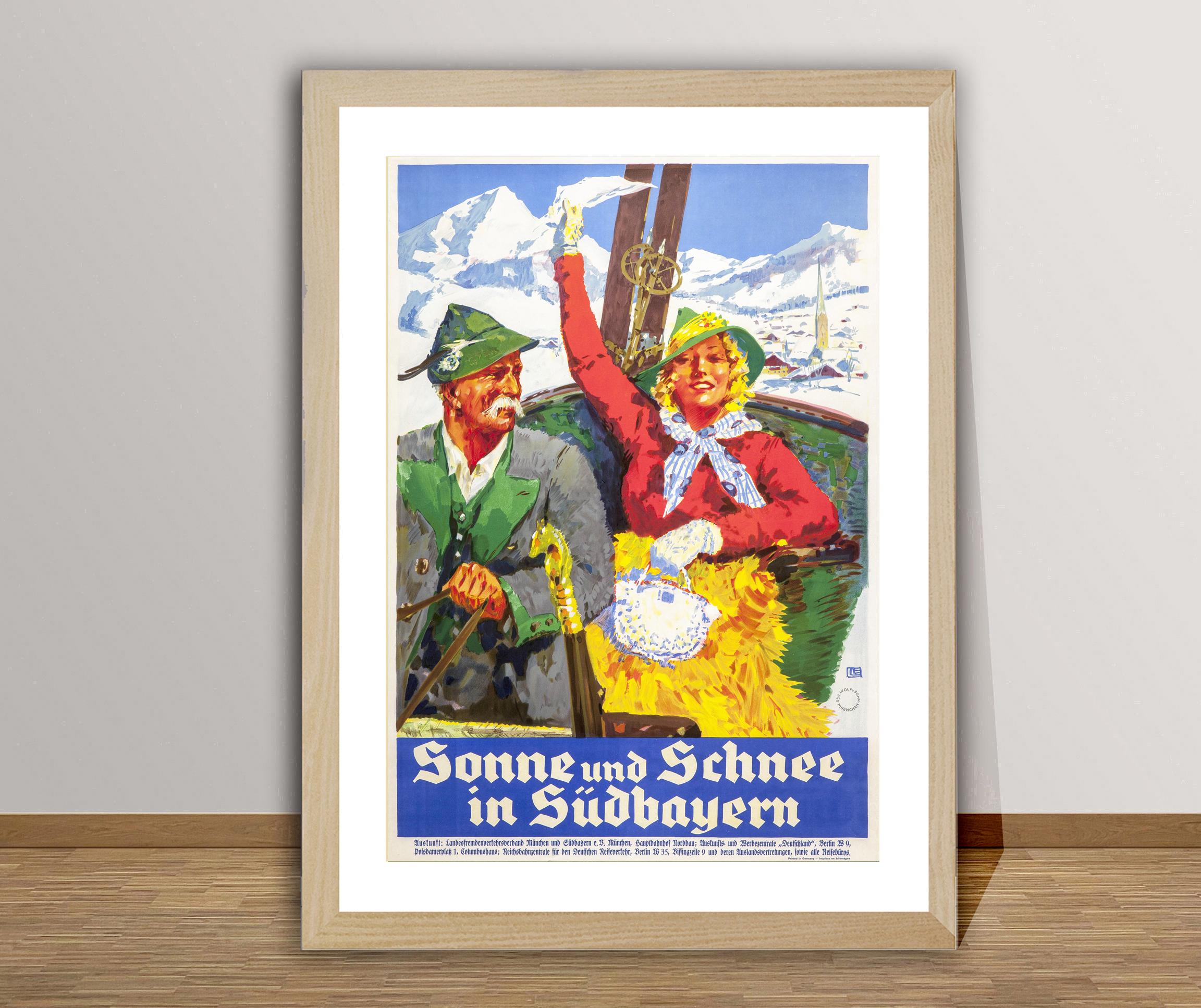 Sonne und Schnee in Südbayern, (Sun and Snow in Southern Bavaria) Germany Vintage Ski Poster- Poster Paper or Canvas Print / Gift Idea