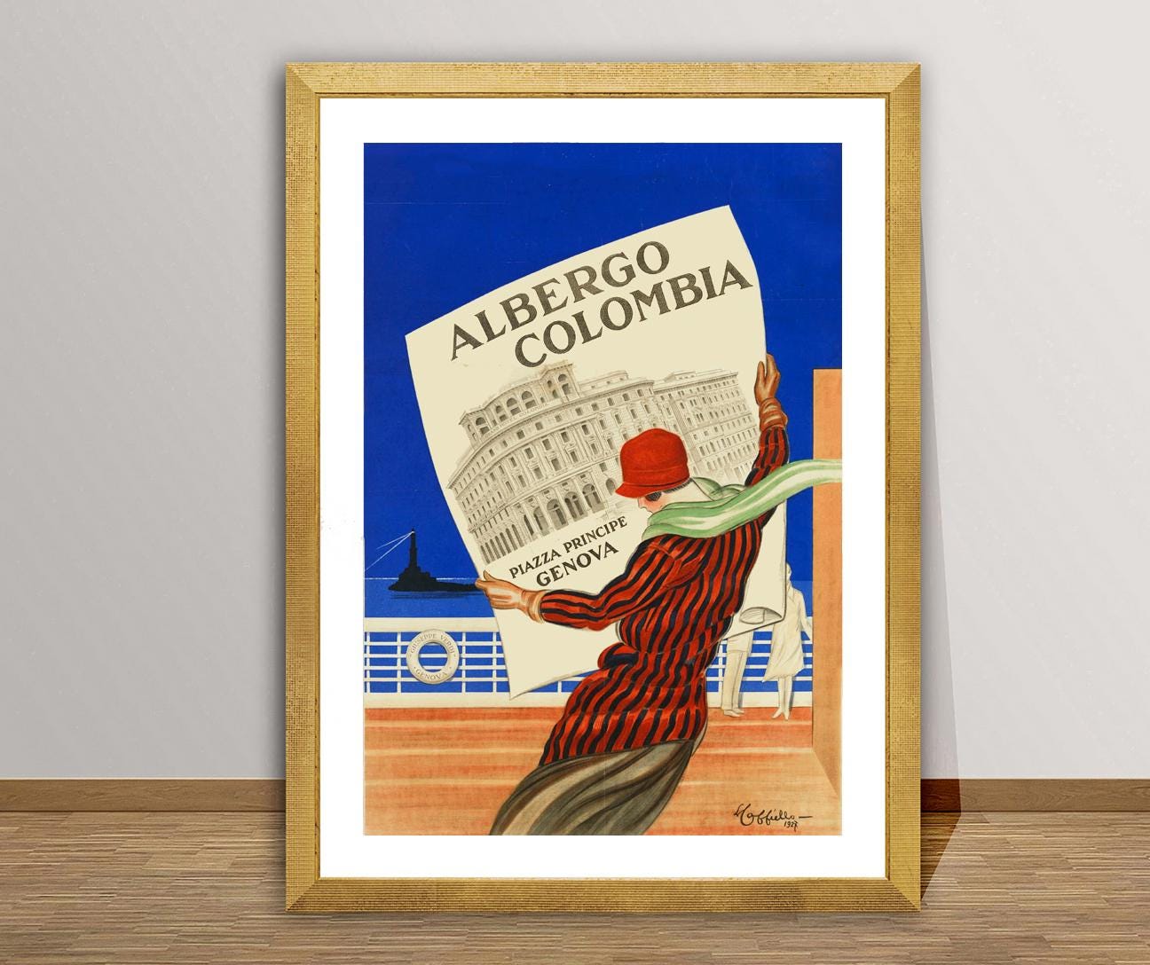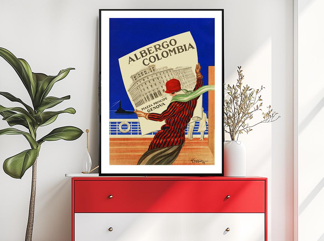 Vintage Albergo Columbia, Genova Travel Poster: Italy Hotel Excelsior Art