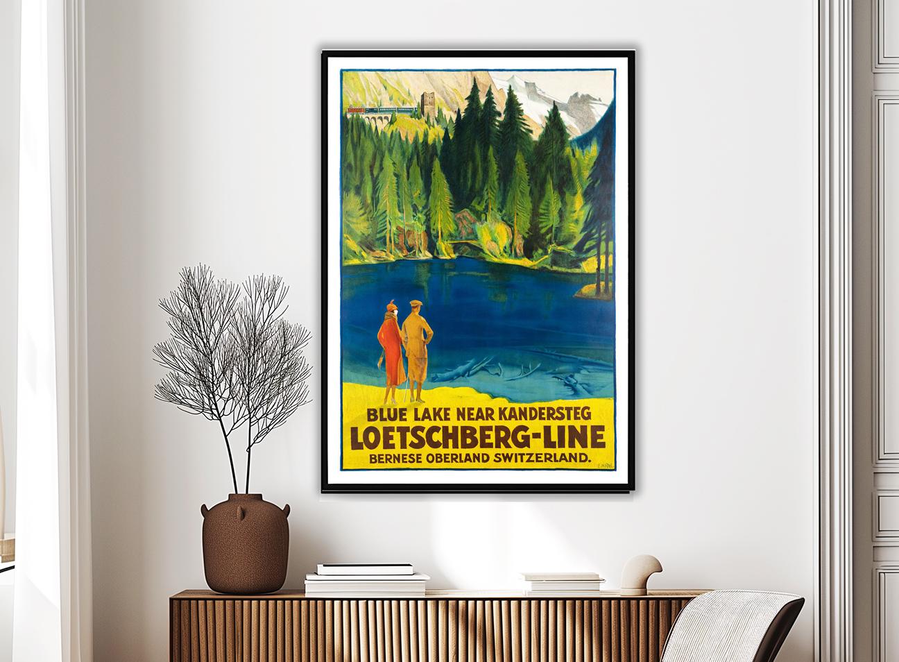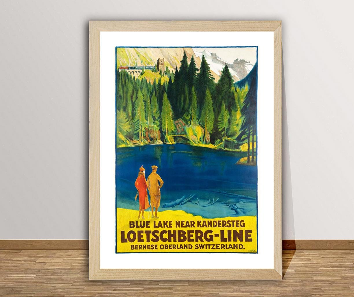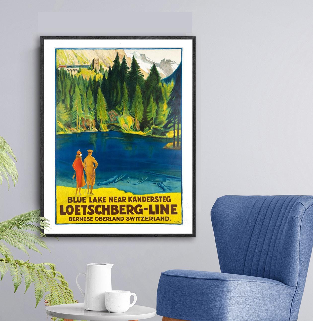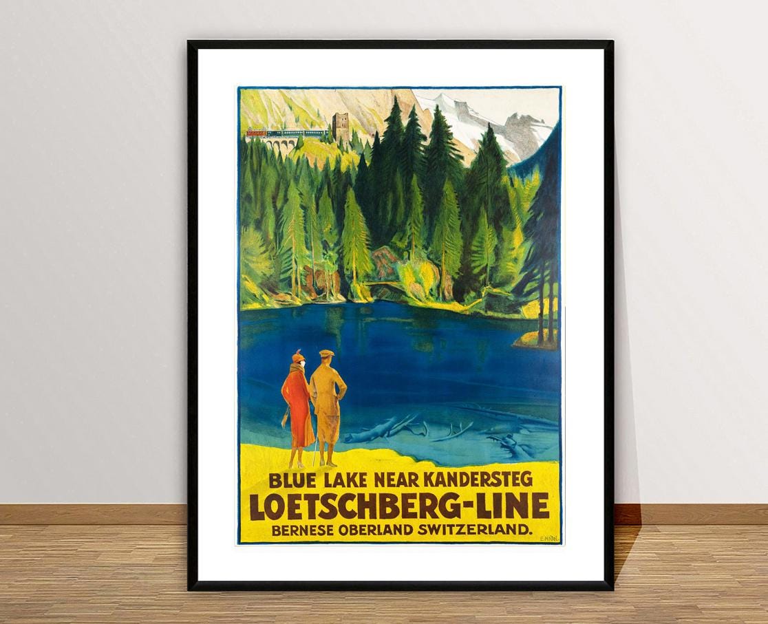 Blue Lake Near Kandersteg, Loetschberg Line, Bernese Oberland, Switzerland Vintage Ski Poster - Poster Paper or Canvas Print / Gift Idea