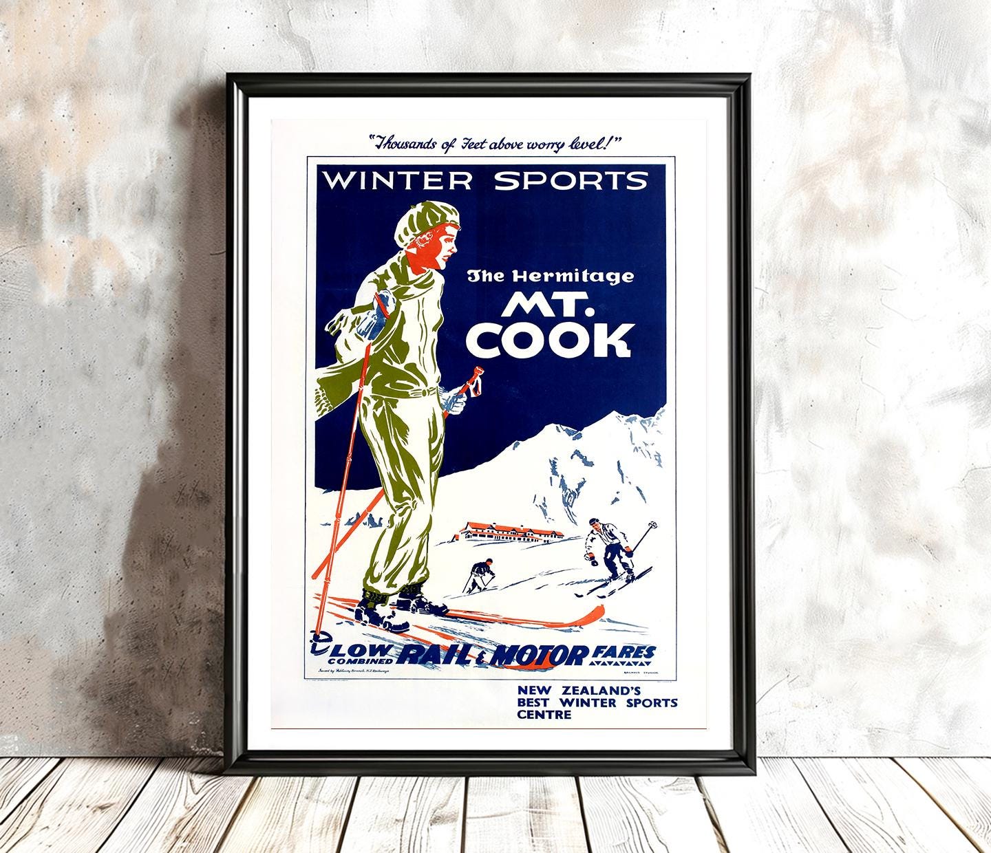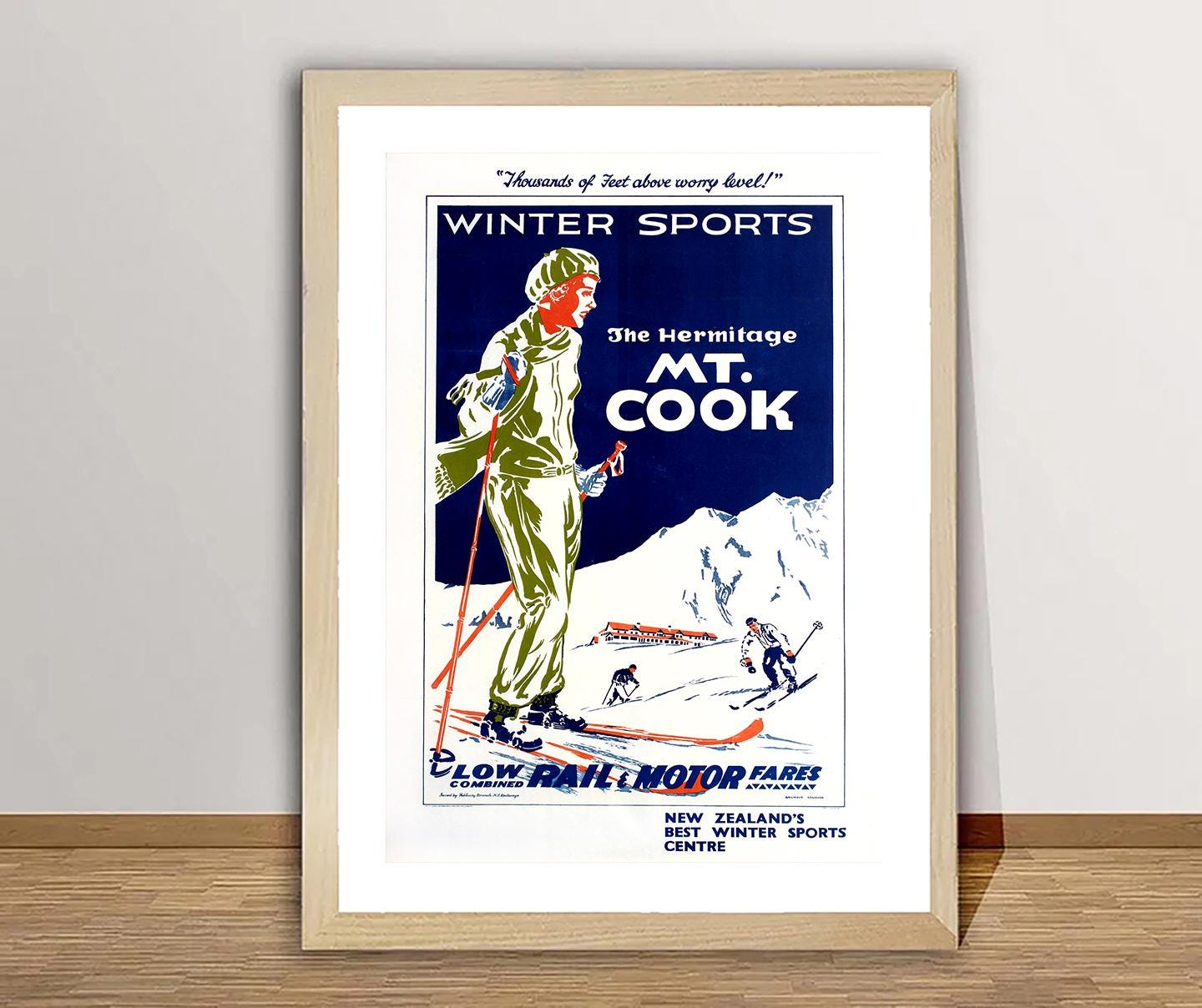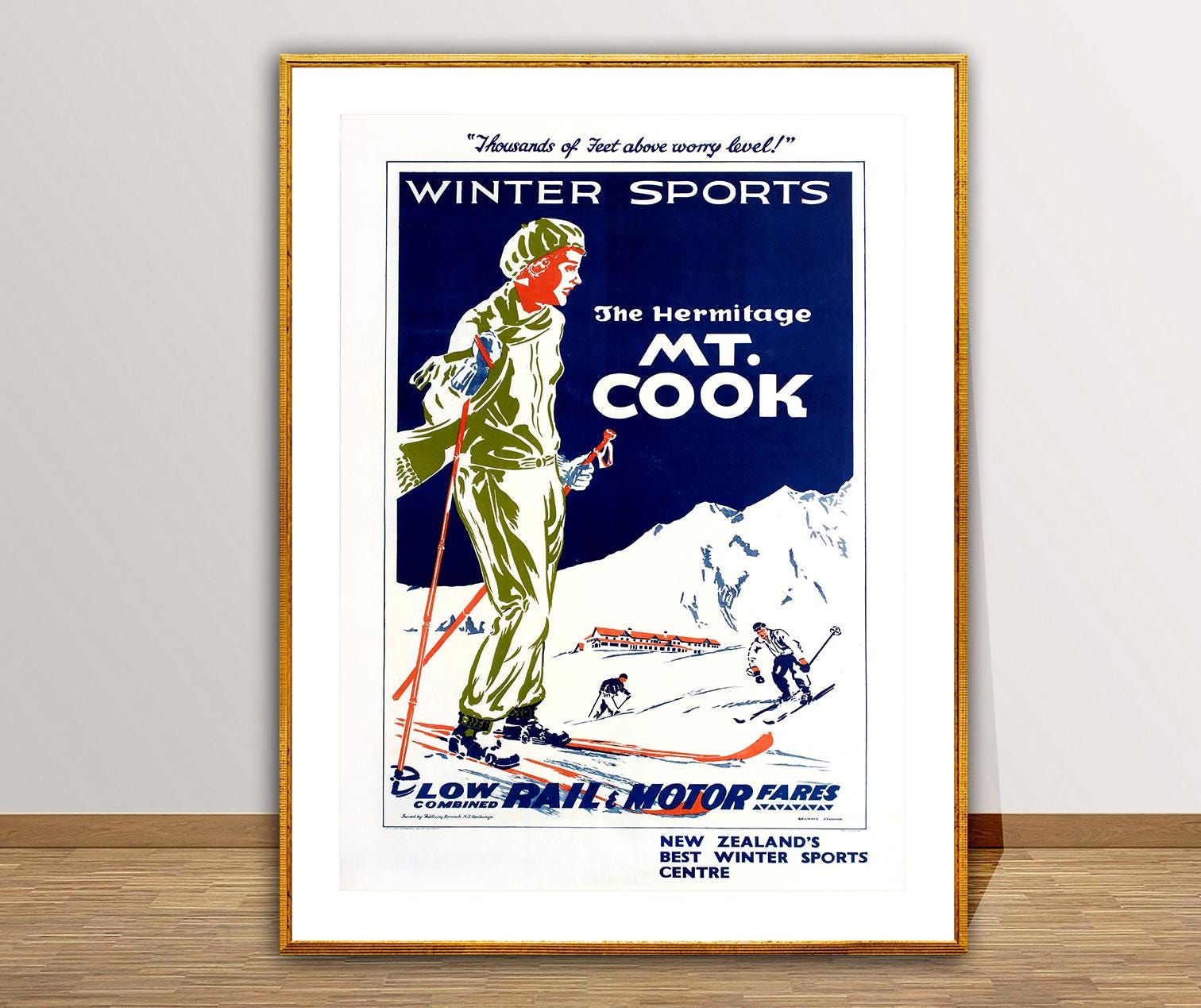 Winter Sports Mt. Cook, New Zealand Vintage Travel Poster - Poster Paper or Canvas / Gift Idea / Wall Decor
