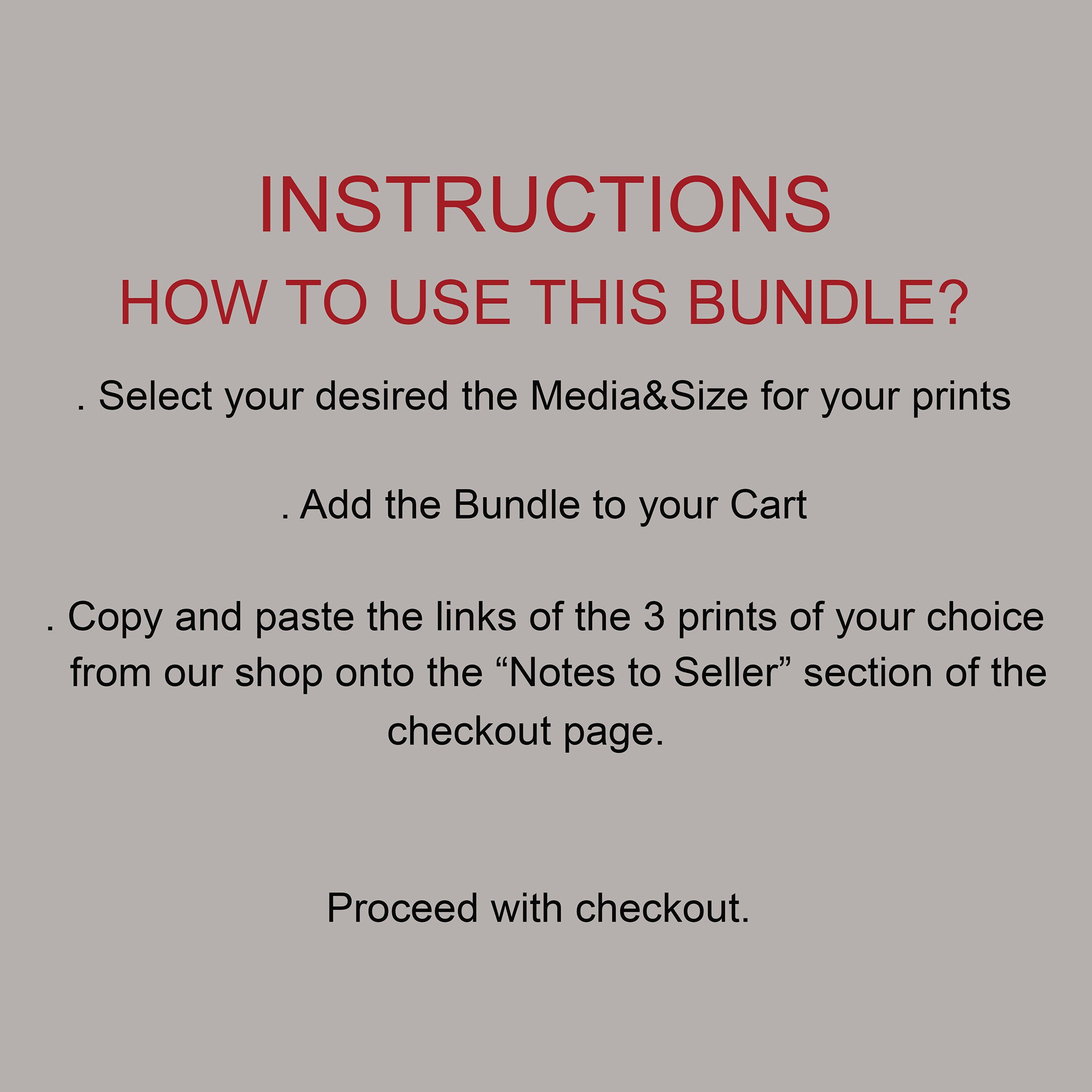 If you have any high resolution image you want printed, you can go to our “Bundles“ section and add our "Print for Me" bundle to your cart after you choose the media type and size at the item‘s page. The pricing is same with the standard sizes & media types mentioned in all of our other available products. For your instructions on the print, i.e border request, color adjustment etc. you can use the Notes to Seller section in the checkout page. After checkout, you can mail the digital file to info@artyposters.com as attachment. You can also contact us by clicking the “Ask a Question“ button on the item page.