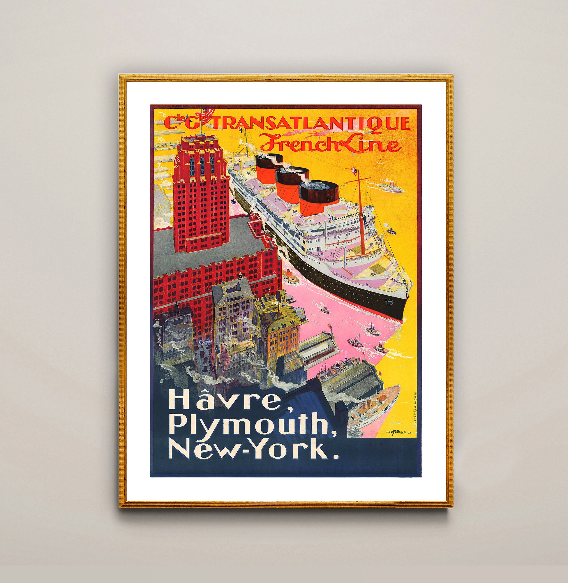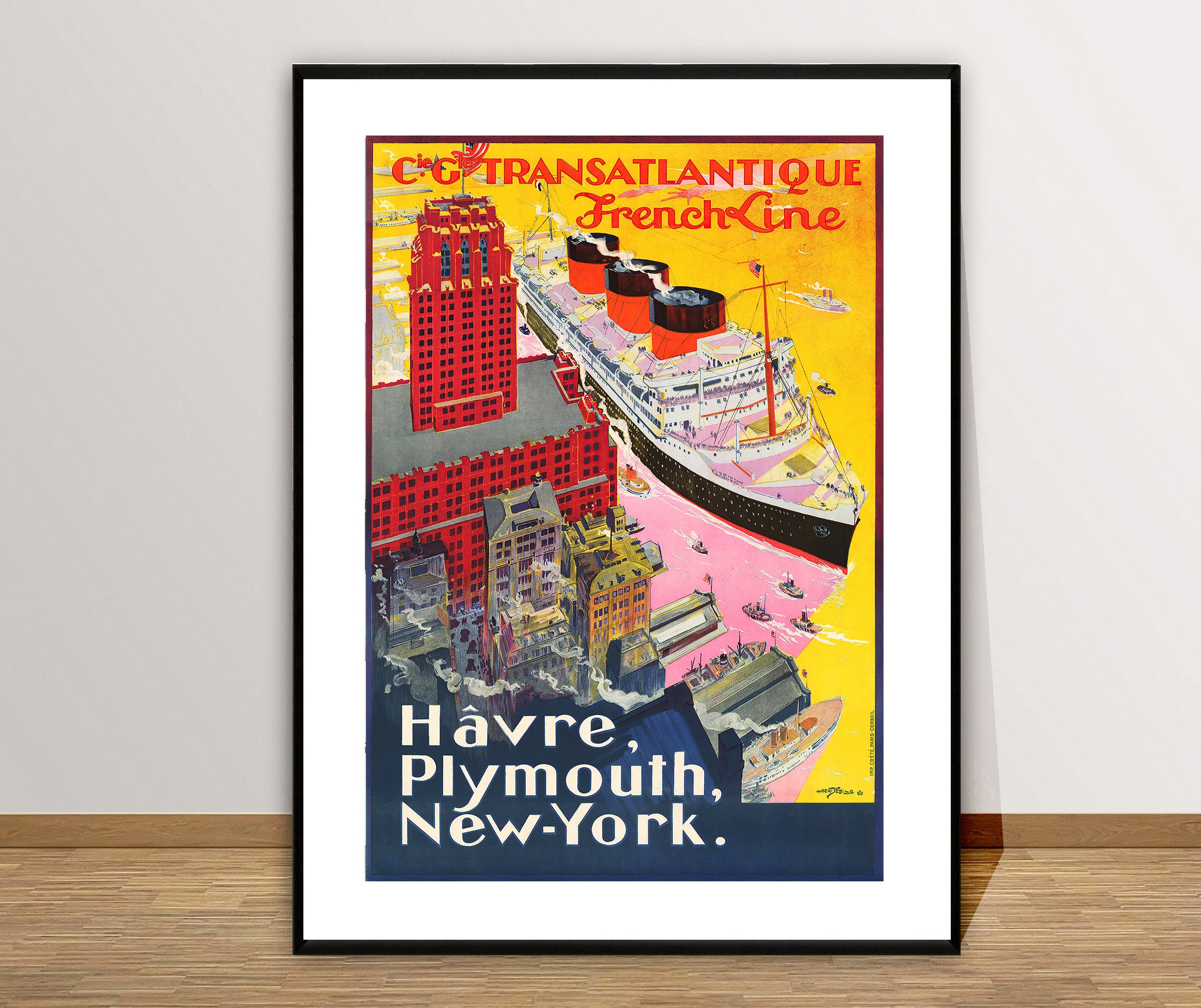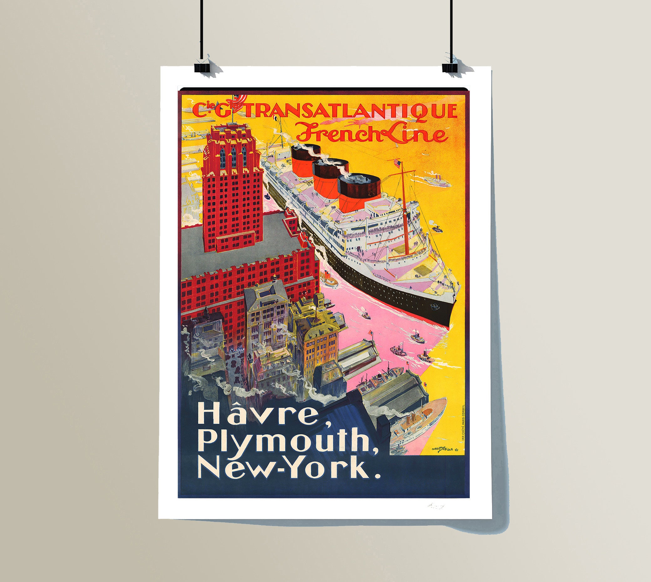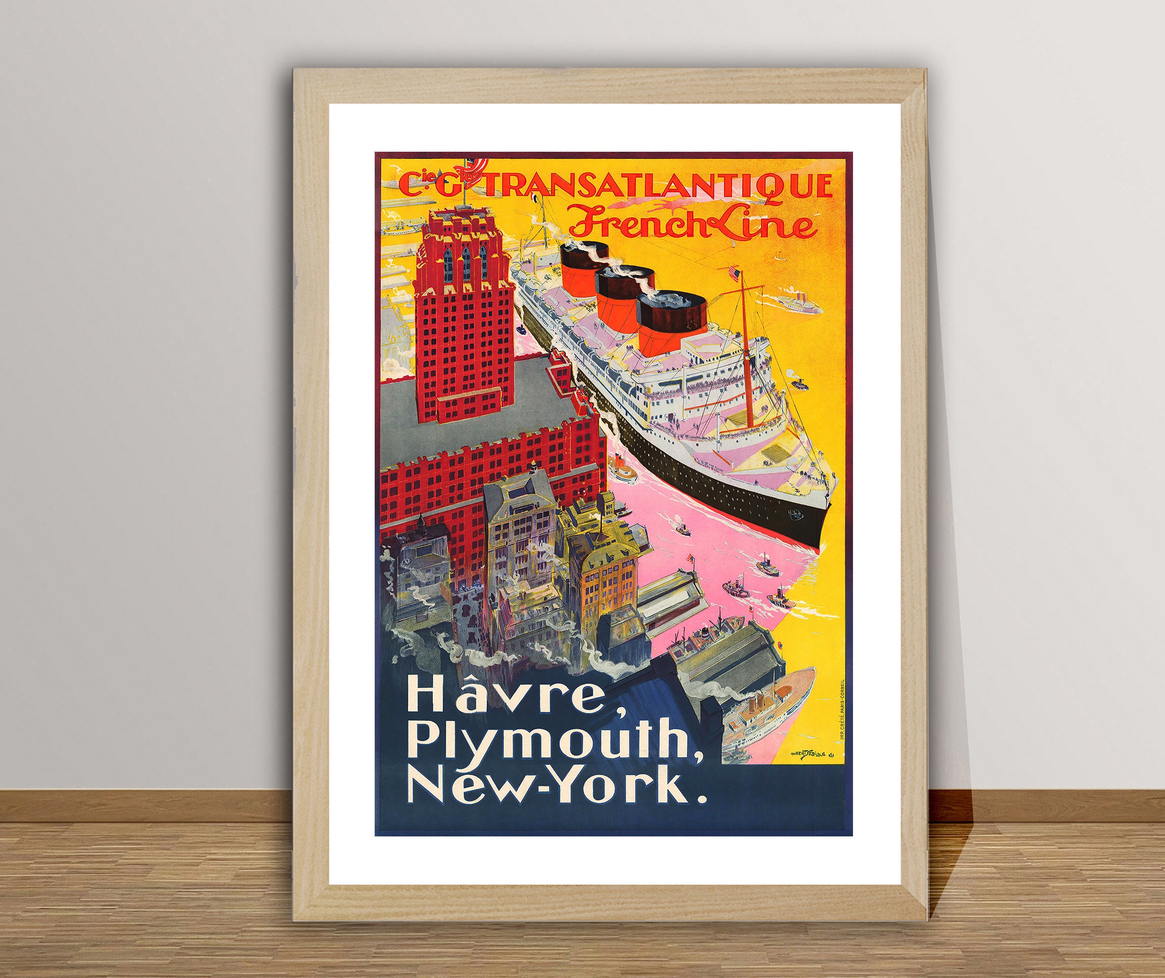 Cie G Transatlantique French Line Havre Plymouth New York Vintage Travel Poster - Poster Paper or Canvas Print