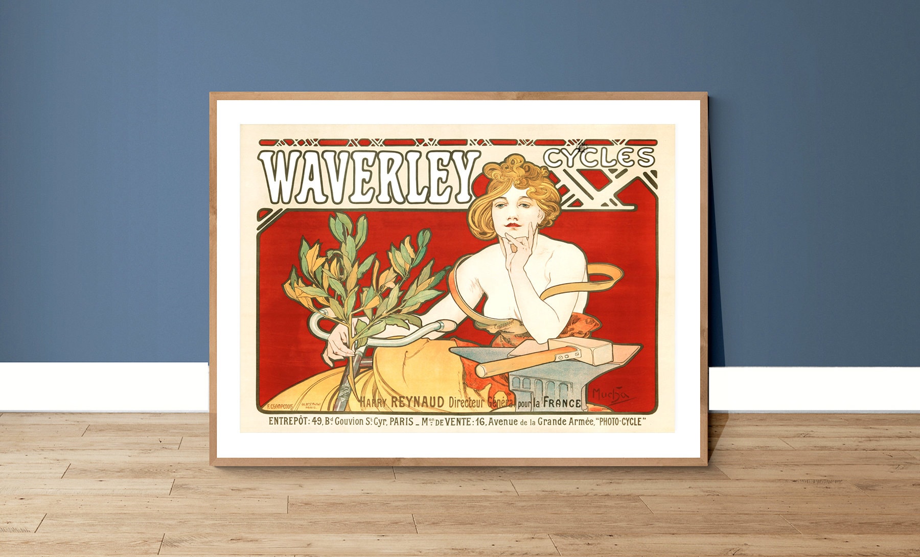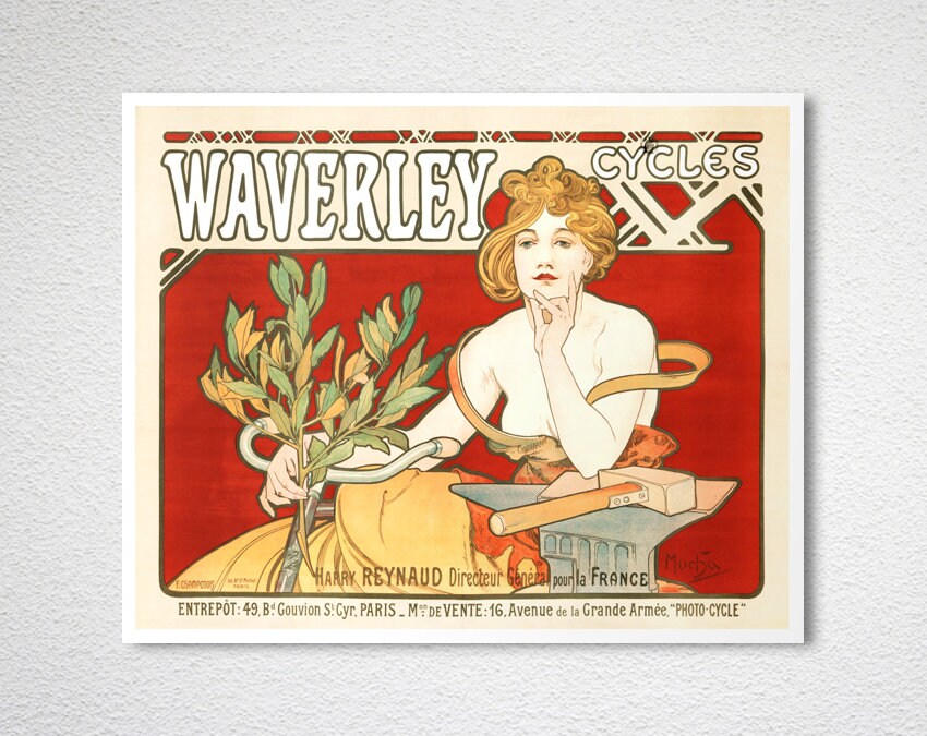 Waverley Cycles Vintage Bicycle Poster by Alphonse Mucha - Poster Paper or Canvas Print