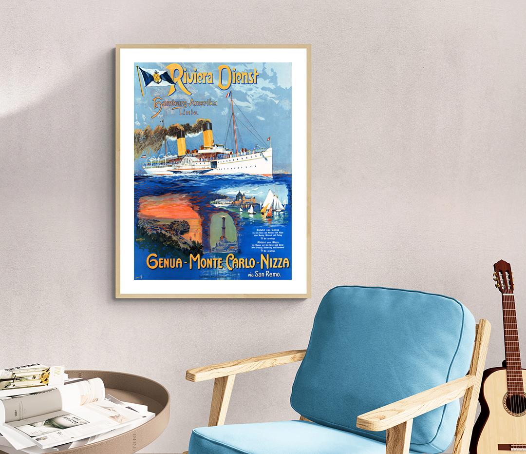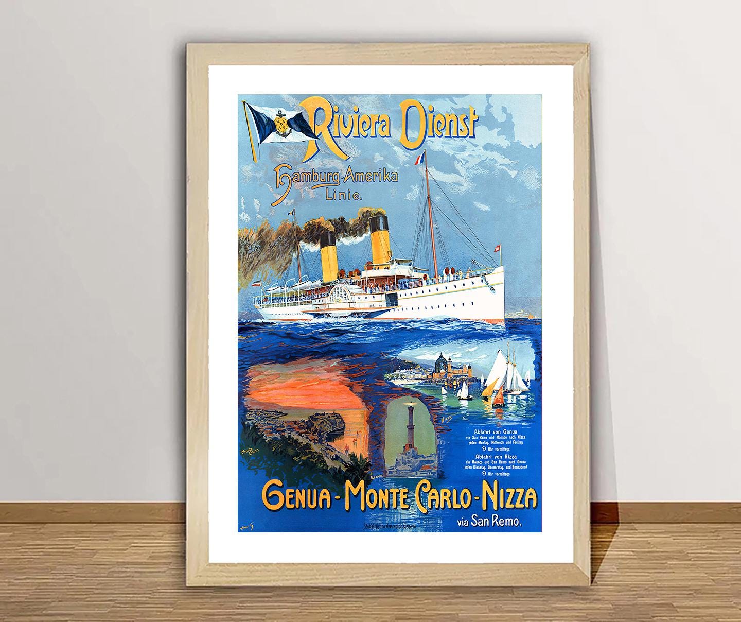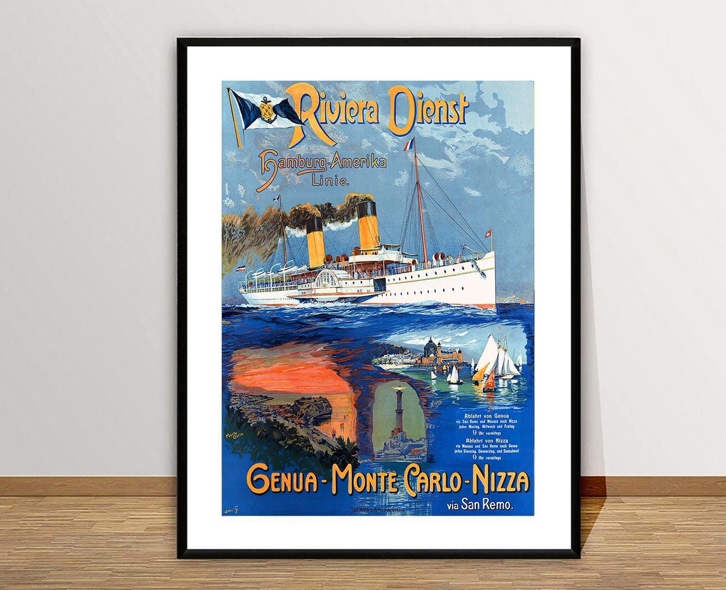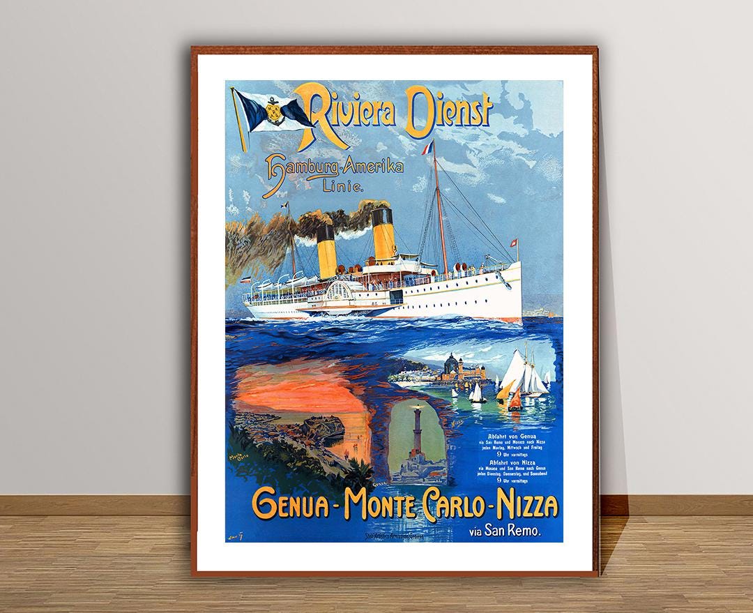 Riviera Dienst Hamburg Amerika Linie Genua, Monte Carlo, Nizza Vintage Travel Poster - Poster Paper or Canvas Print