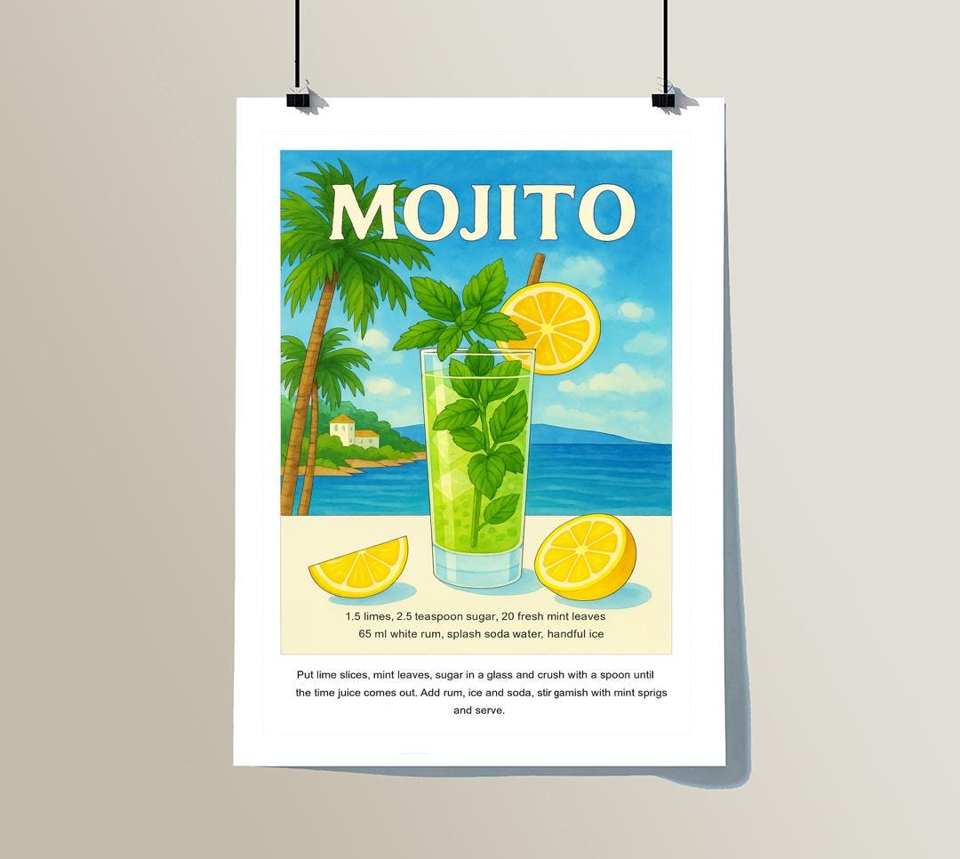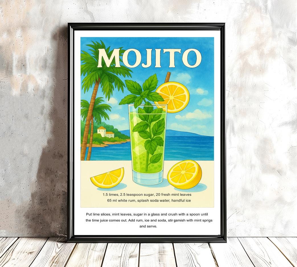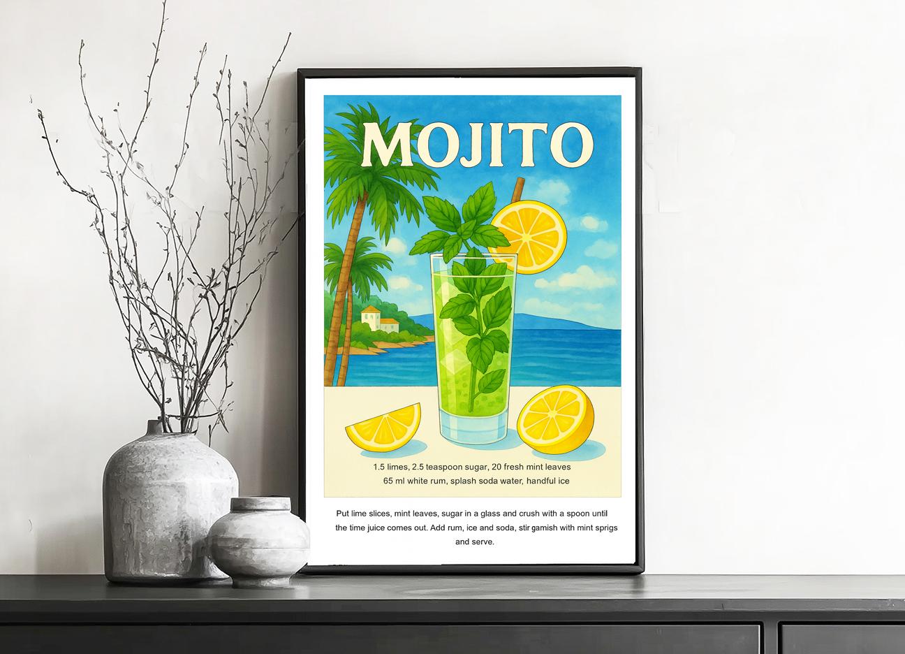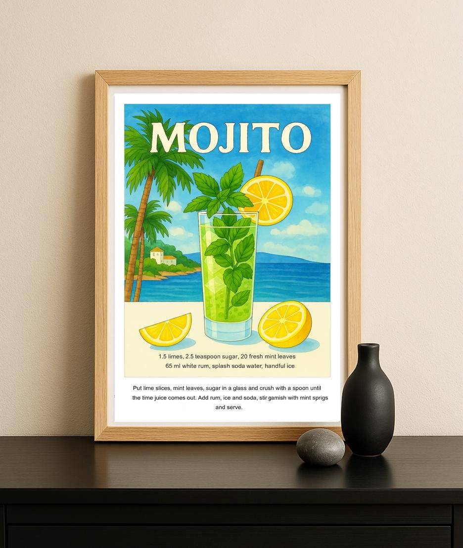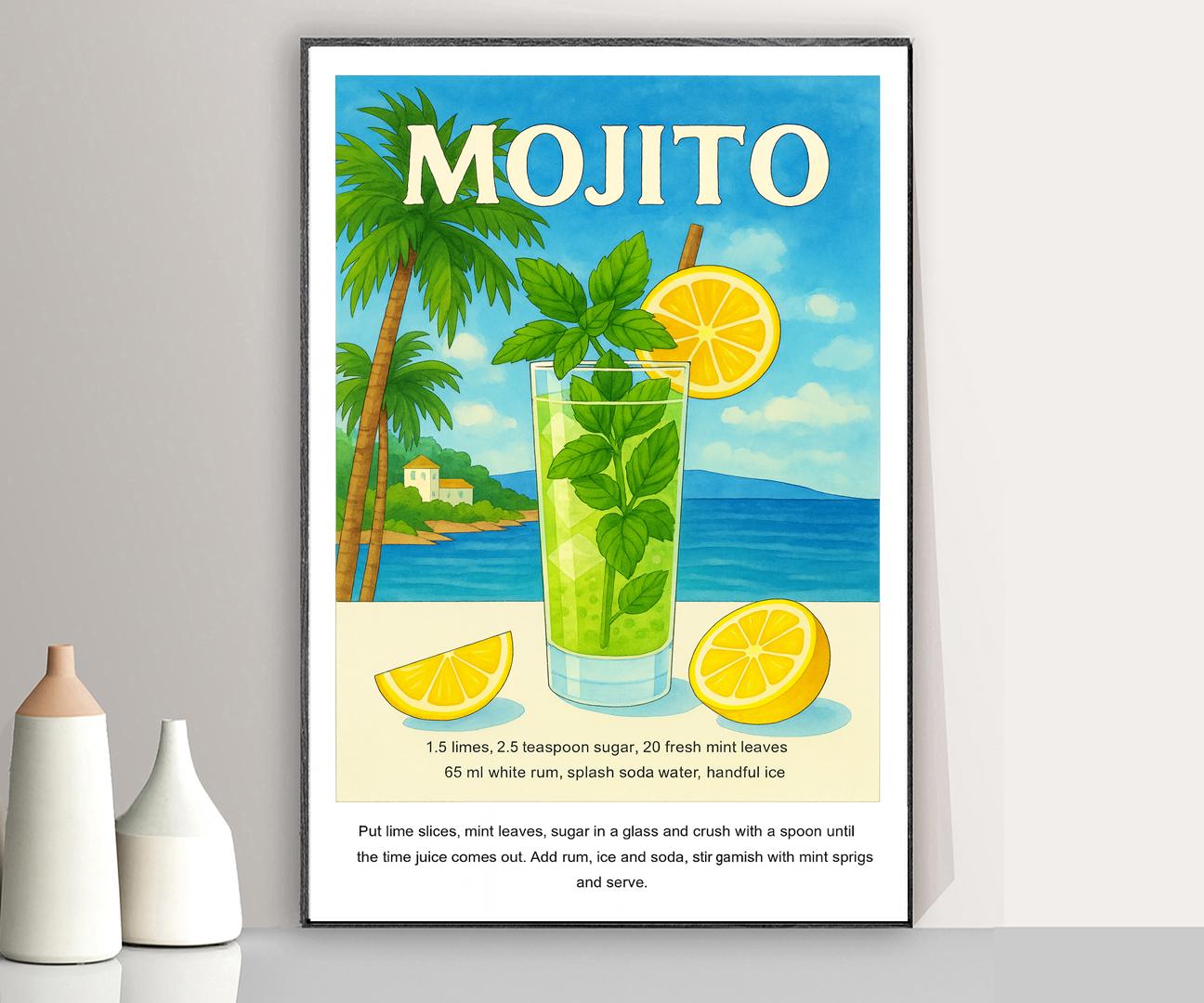 Mojito Cocktail Recipe Poster: Summer Beverages Art Print