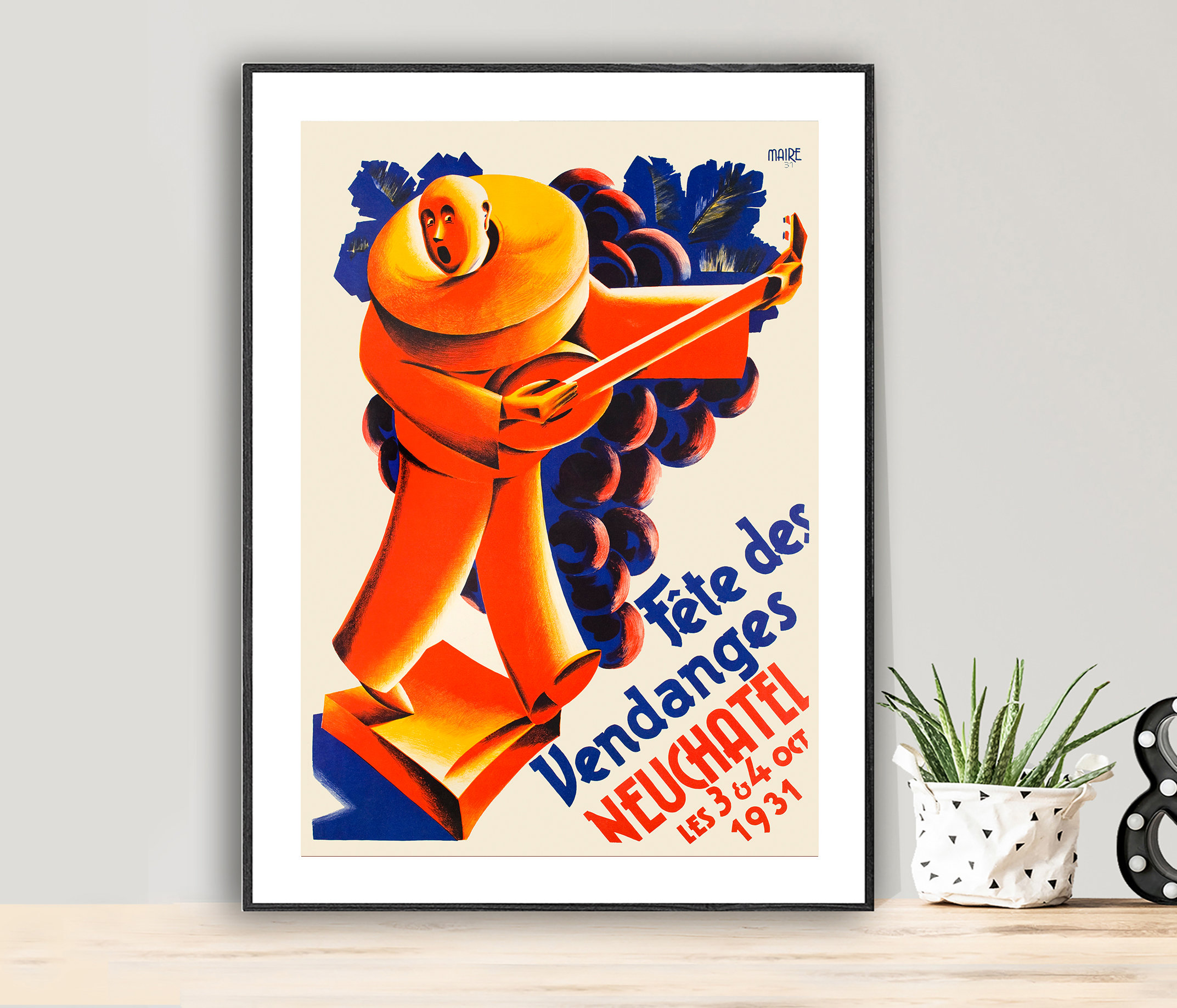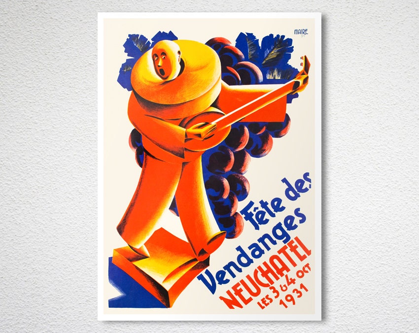 Vintage Grape Harvest Festival Poster: Neuchatel, Suisse Travel Print