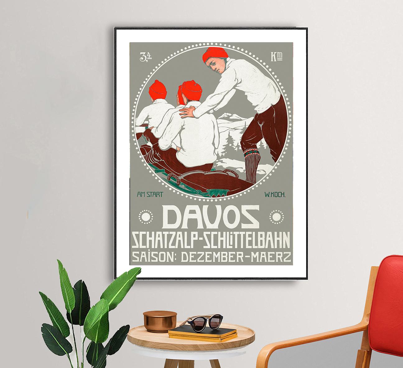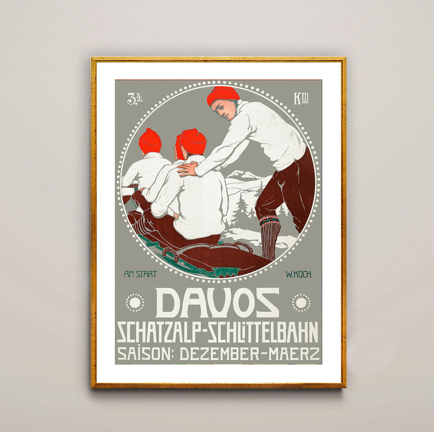 Davos Switzerland Vintage Ski Poster: Schatzalp-Schlittelbahn