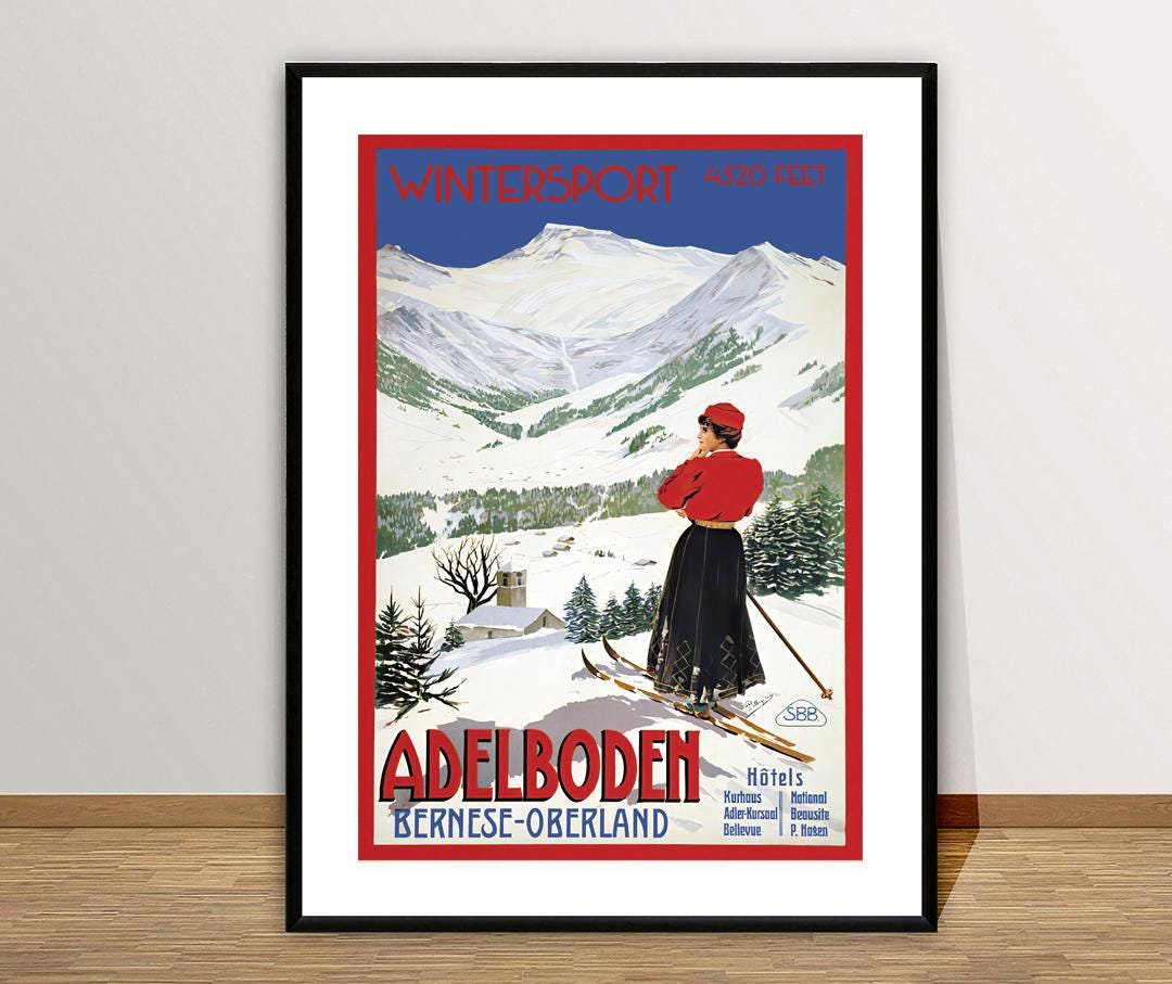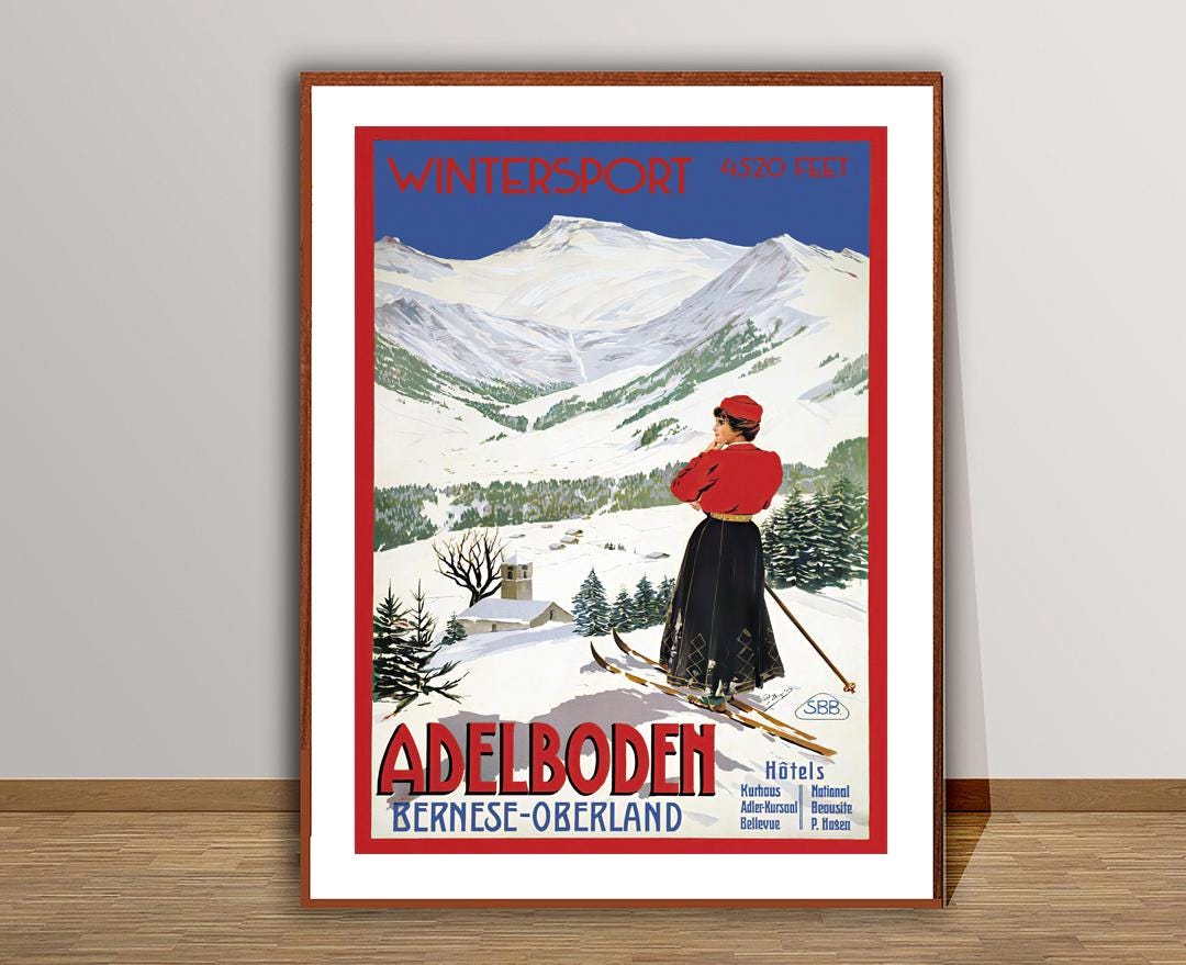 Wintersport Adelboden Bernese Oberland, Suisse Vintage Ski Poster - Poster Paper or Canvas Print / Gift Idea