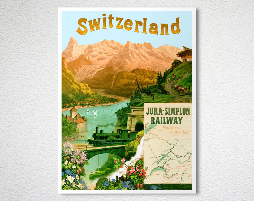 Switzerland Jura Simplon Railway Vintage Travel Poster - Poster Paper or Canvas Print / Gift Idea
