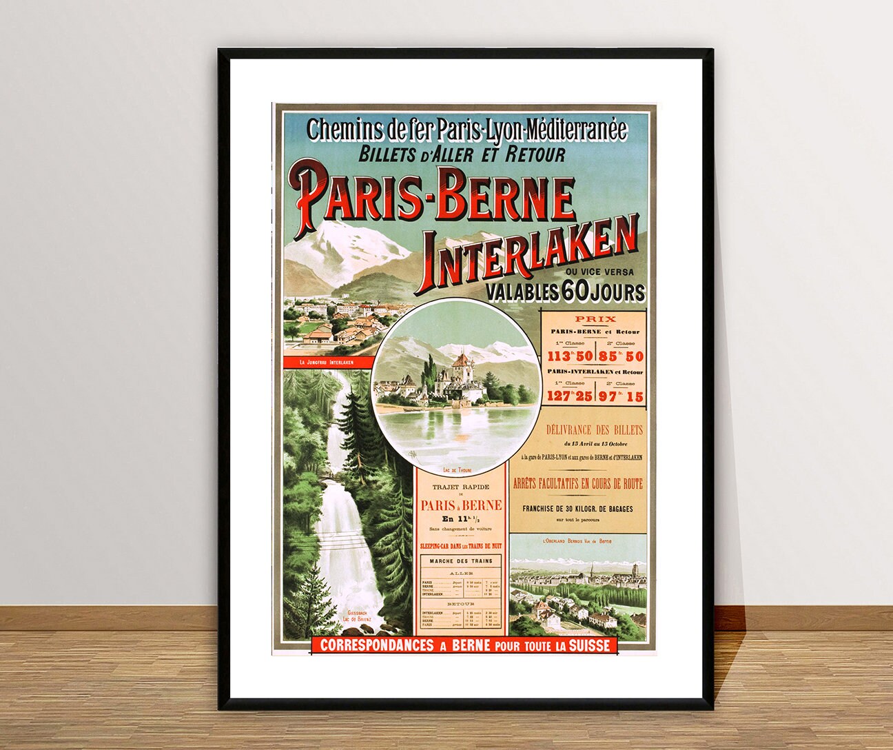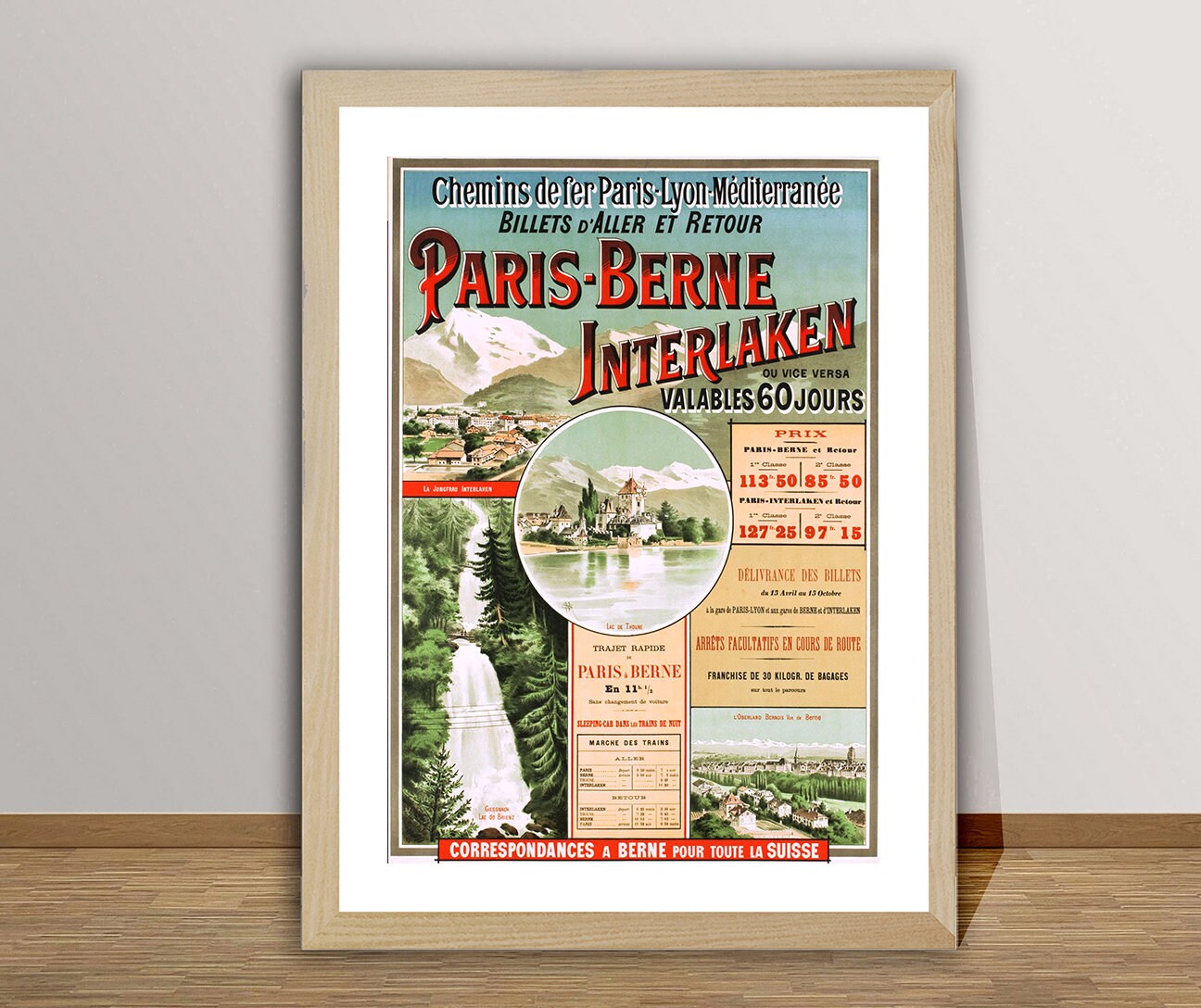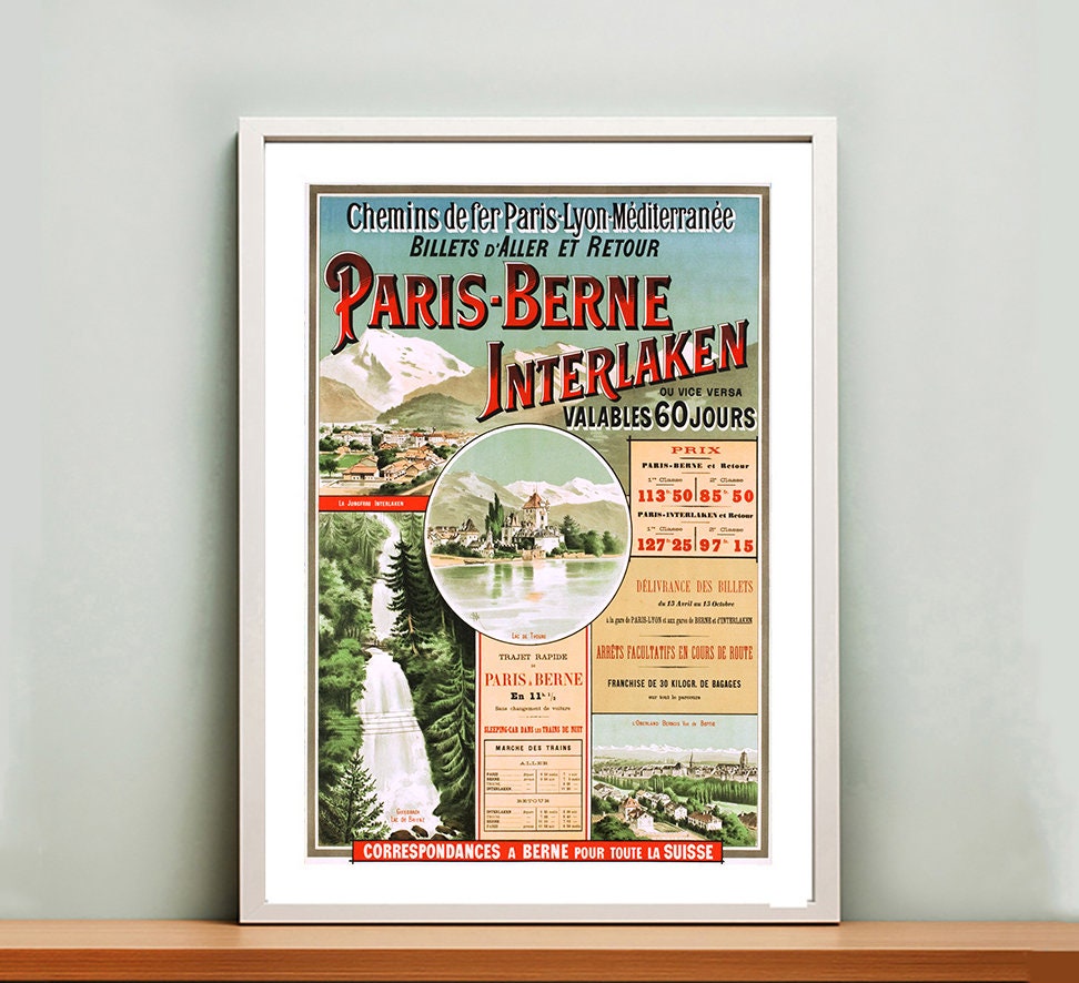 Paris Bern Interlaken Vintage Travel Poster - Poster Paper or Canvas Print / Gift Idea